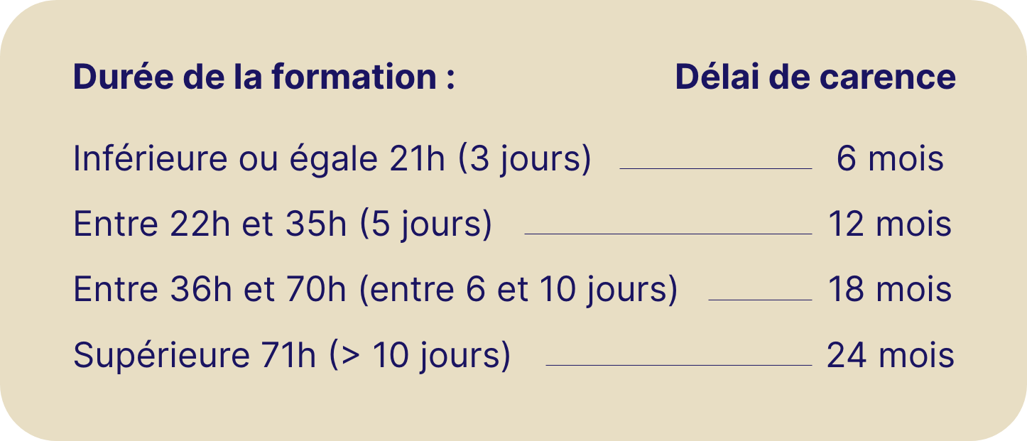 Si tu as terminé une formation de 3 jours à la date du 30 septembre 2025, tu devras attendre 6 mois avant de pouvoir refaire une formation. Tu pourras donc recommencer une formation à partir du 1er avril 2026.