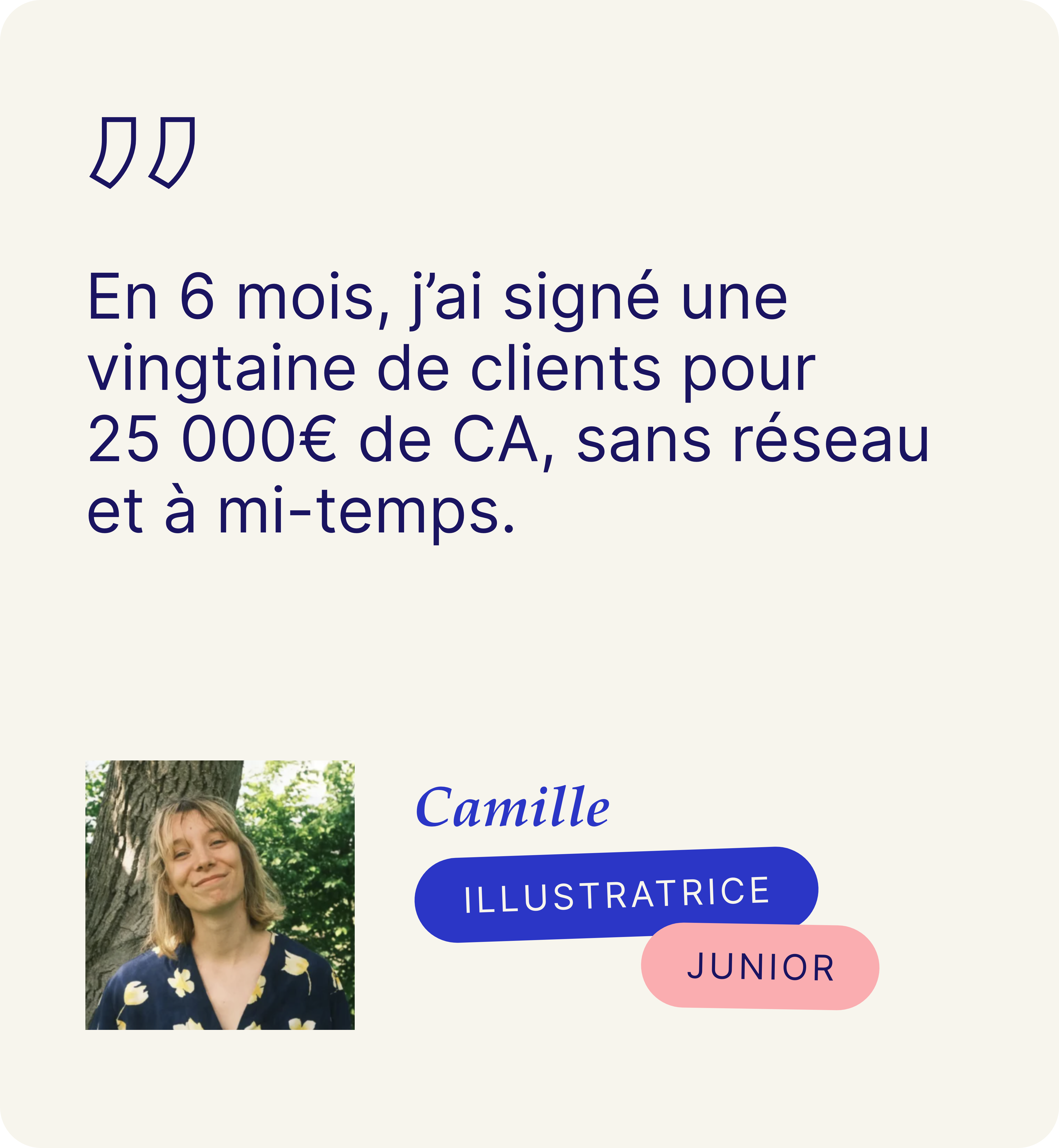 Tu es artiste-auteurice ? Pendant 16 semaines, tu clarifies ton activité, assumes ton TJM et apprends à trouver les clients qui te correspondent, que tu sois junior, intermédiaire ou senior.