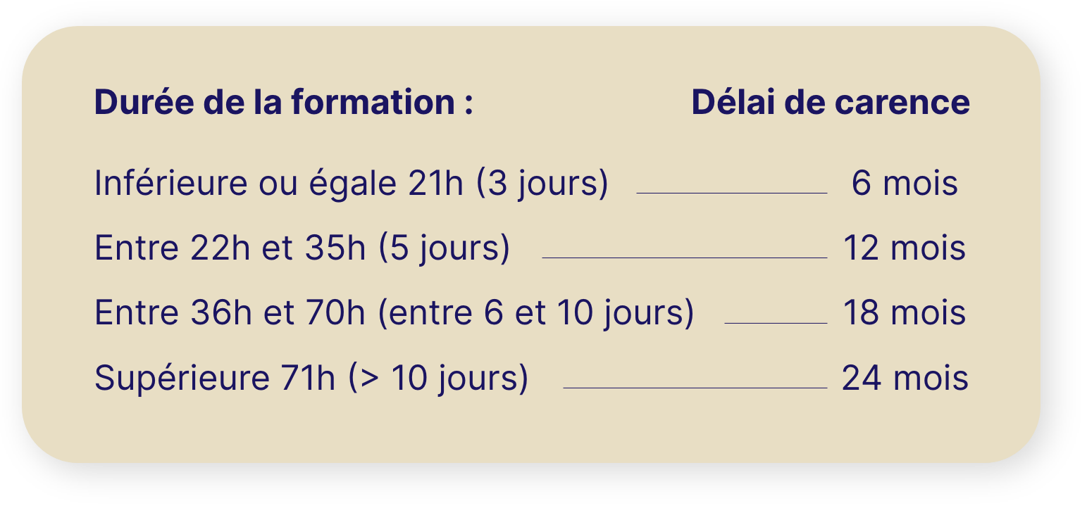 Si tu as terminé une formation de 3 jours à la date du 30 septembre 2025, tu devras attendre 6 mois avant de pouvoir refaire une formation. Tu pourras donc recommencer une formation à partir du 1er avril 2026.